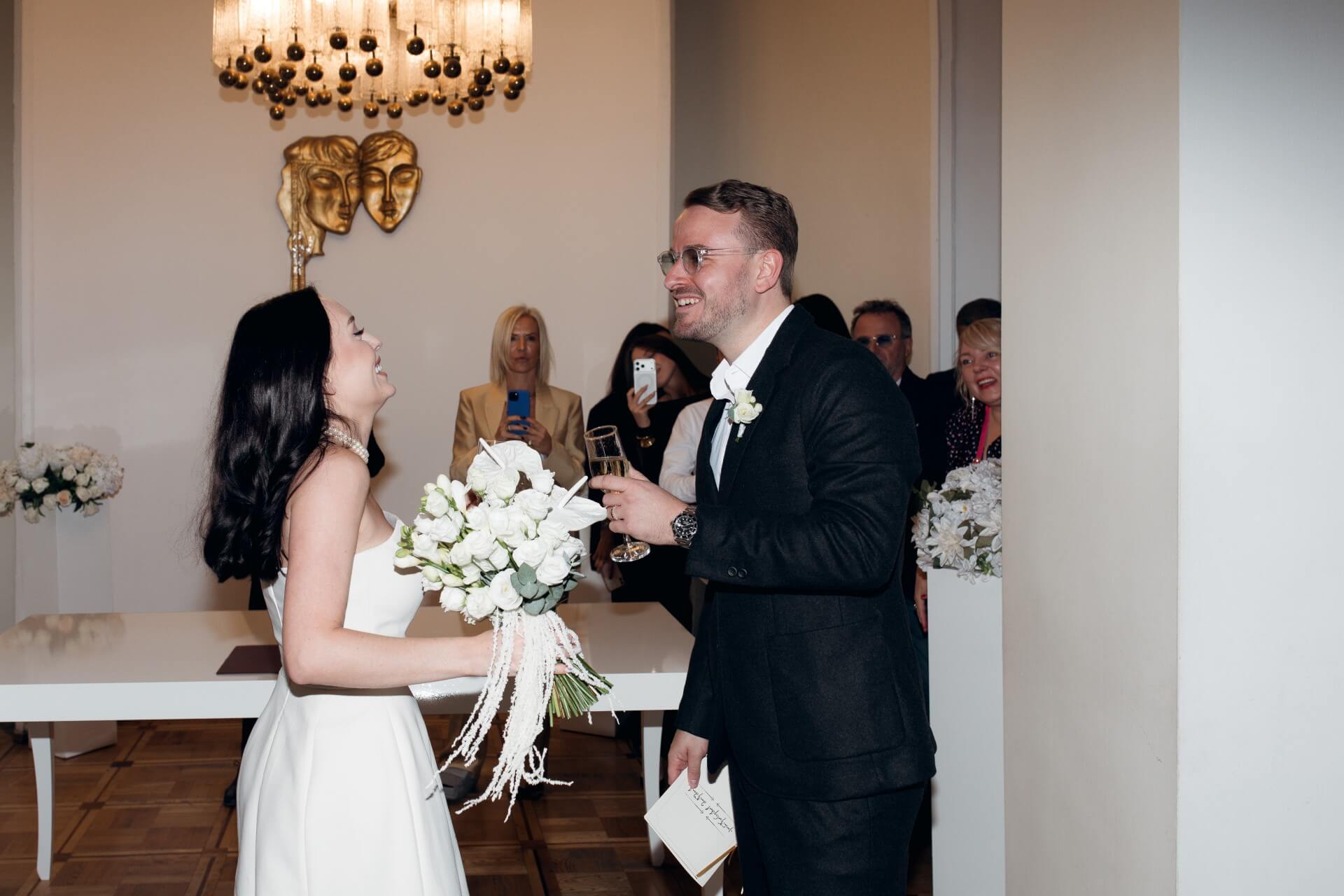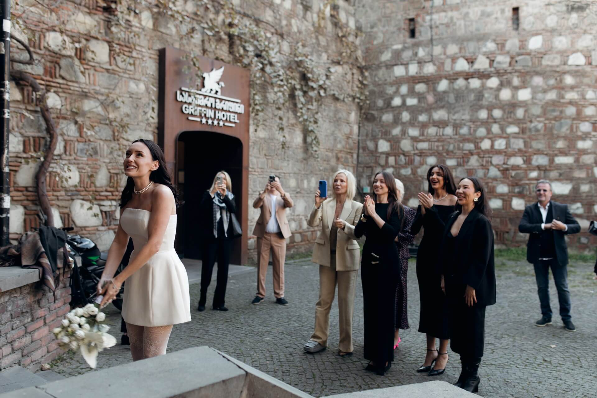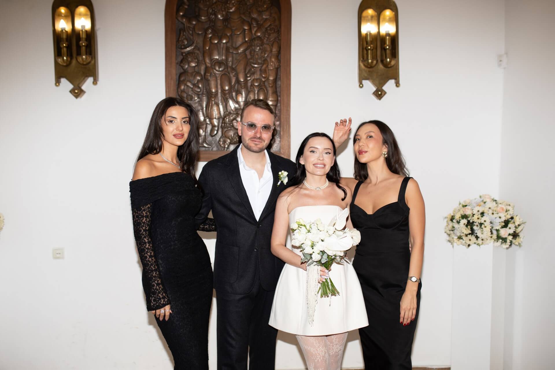 Утро началось с макияжа. Визажист приехал прямо в отель и создал для невесты легкий, сияющий образ, который подчеркивал естественную красоту и свежесть. Флорист подобрал нежные цветы, свадебный организатор позаботился о каждой детали. Все выглядело просто, но изысканно.