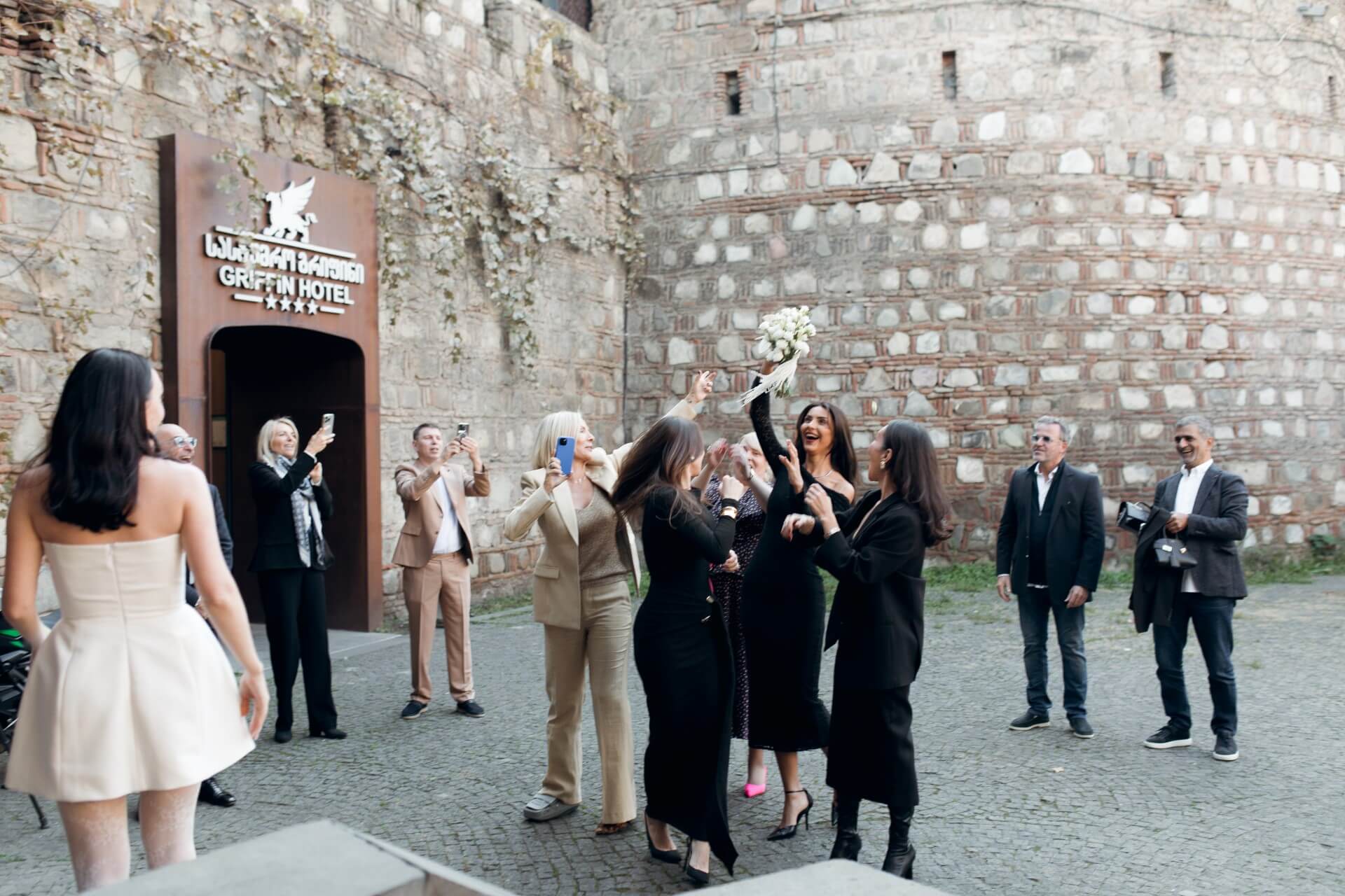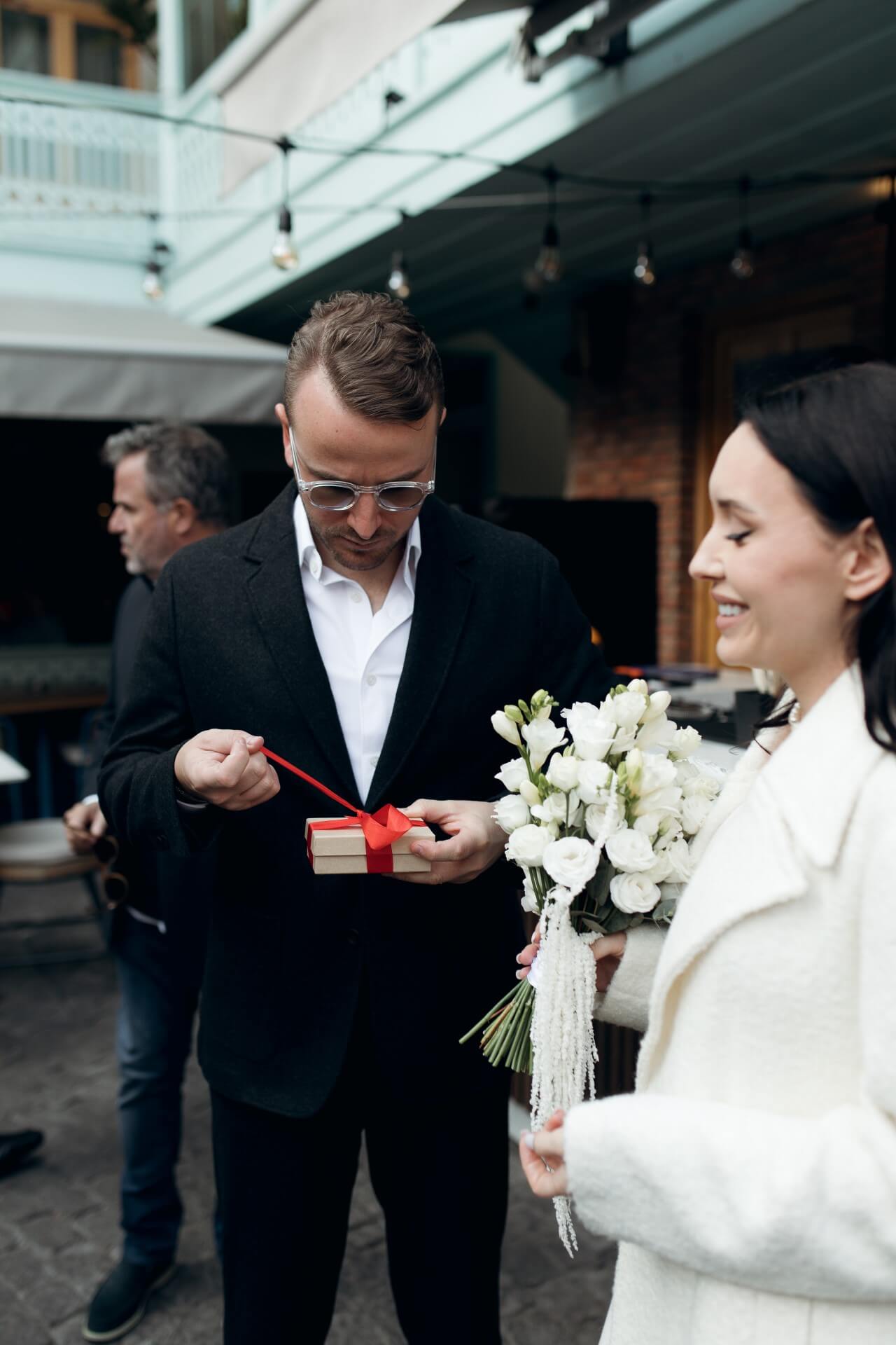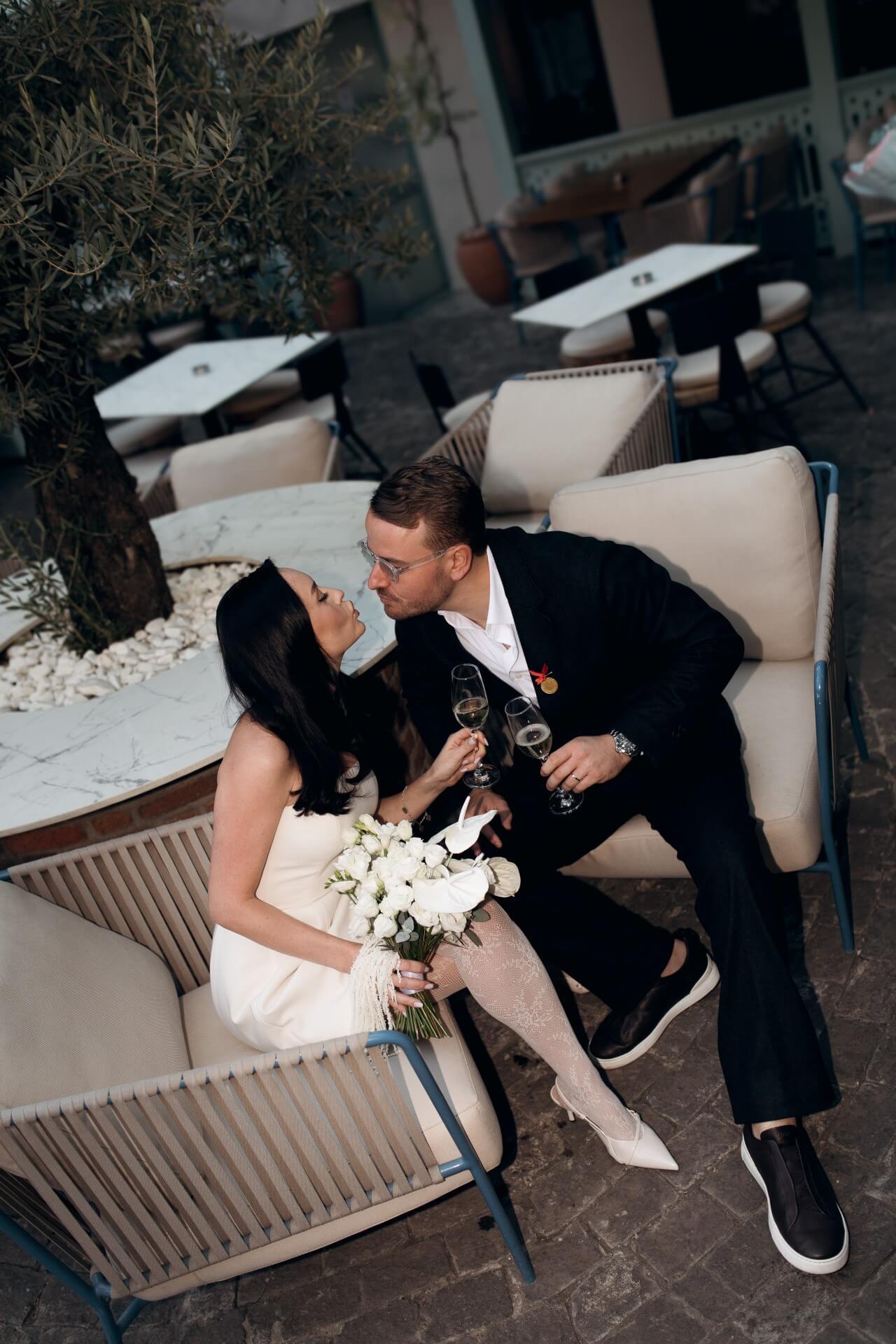 Торжество прошло в уютном ресторане, где для молодых подготовили отдельный зал с видом на старый город. Меню состояло из кавказских традиционных блюд и легких европейских закусок. Нам удалось создать удивительно теплую семейную атмосферу, ведь приглашенных было совсем немного. Фотографы и видеооператоры сопровождали пару весь день и сделали так, чтобы снимки и видео не выглядели, как постановочные кадры, а были выполнены в формате живой истории – с настоящими эмоциями.