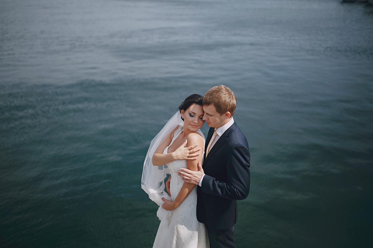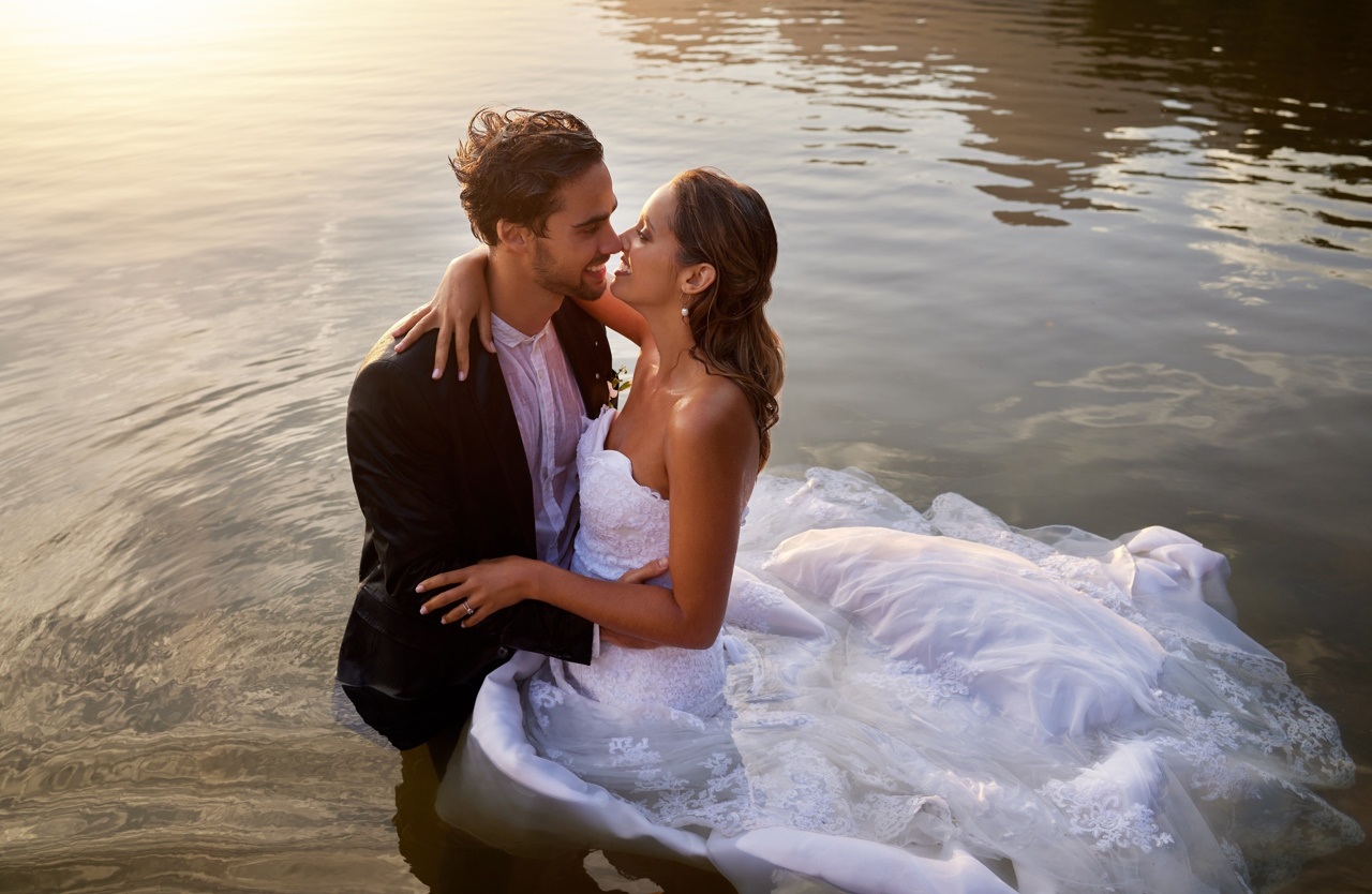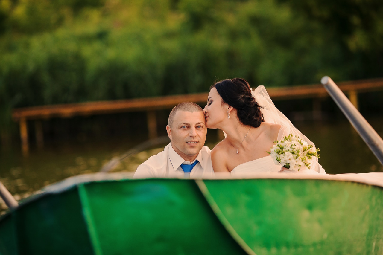 Очень красивые снимки получаются, когда жених и невеста смотрят на свое отражение в озере. Фон из гор на заднем плане придает образам дополнительную романтичность. Чтобы получить оригинальные фото на воде, используйте лодку. Для более драматичного эффекта можно устроить съемку на закате либо ночью с подсветкой. Самое мягкое естественное освещение – когда солнце поднимается и садится.